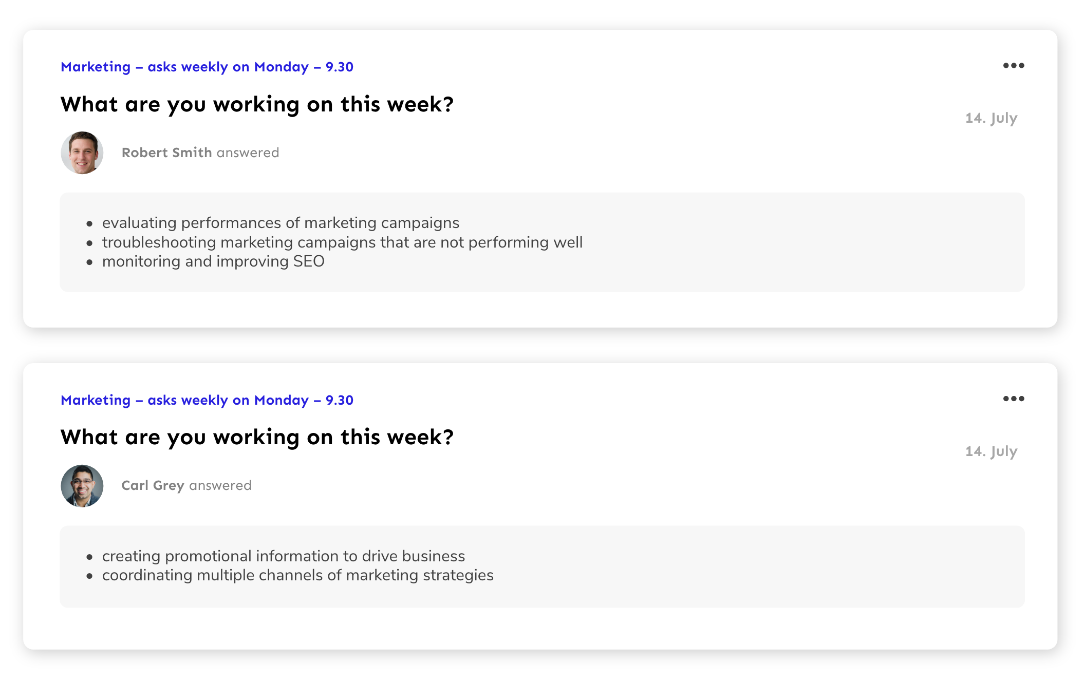 While working on a project it's very important to keep everyone informed. By answering the questions you show everyone what you are working on and you can also see what your colleagues are doing. In this way your colleagues and you get a better understanding for each others workload and it's easier to react if someone needs help or a project is going in a wrong direction.